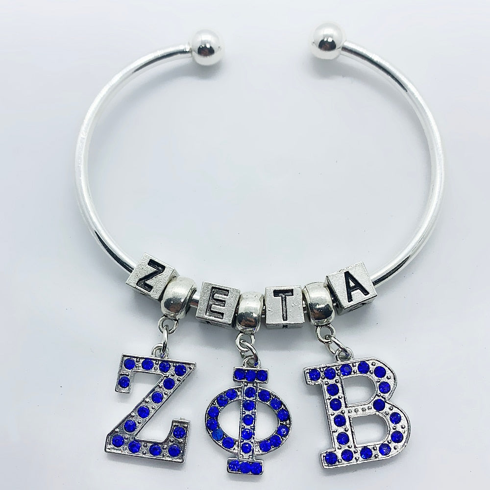Blue rhinestone inlaid metal Greek letter ZETA PHI BETA pendant big hole beads bracelet sorority society opening wire bangle