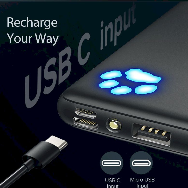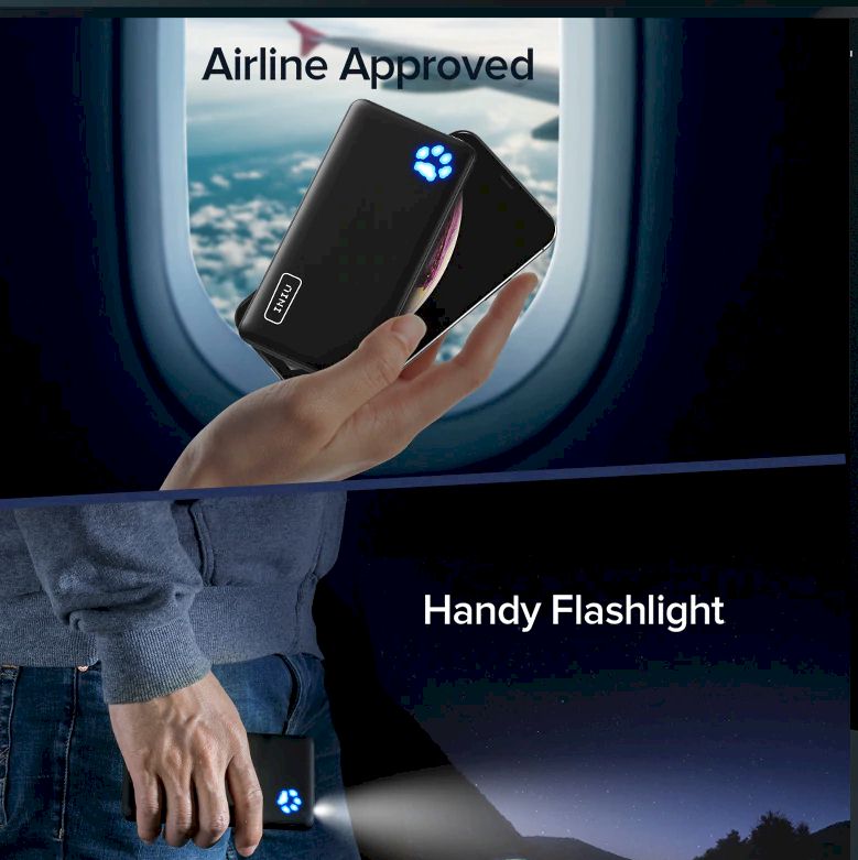 The thinnest 10000mAH charger available. It takes up very little space. Dual High Speed Outputs... Airline Approves and a handy flash light. Keep you phone, tablet and laptop energized and at the ready.