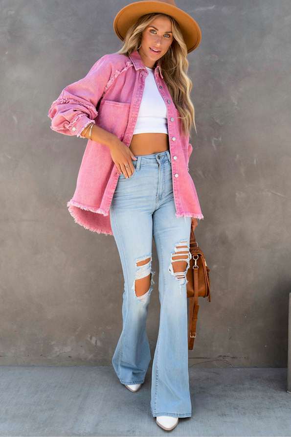 • Look super cool in the Frayed Hemline Denim Shacket that features front button closures.