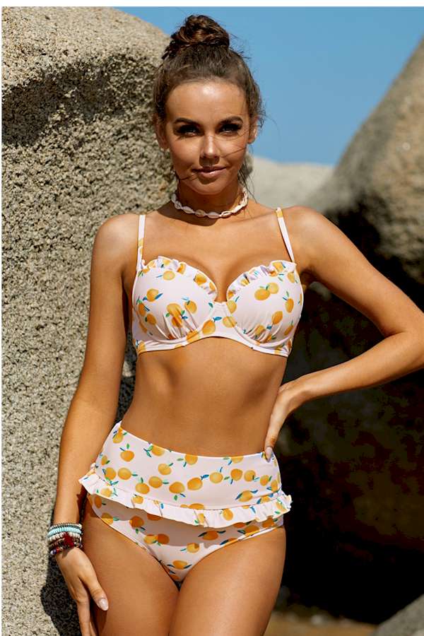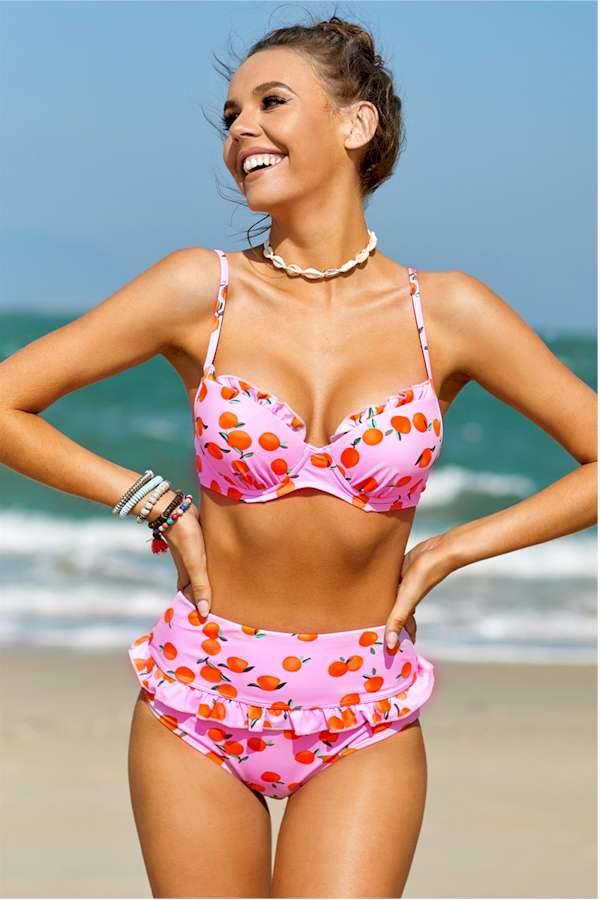 Pink Fruit Print Ruffled Detail High Waist Bikini