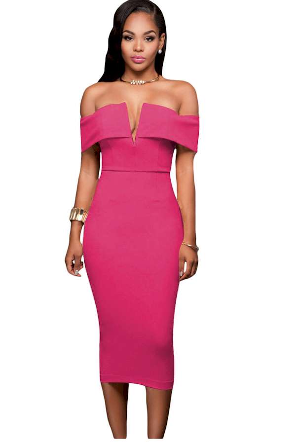 Dare to stand out in this adventurous pink midi dress! With its off-the-shoulder design, you'll be ready to take on any challenge. Strut your stuff and make a statement with this fun, flirty style!