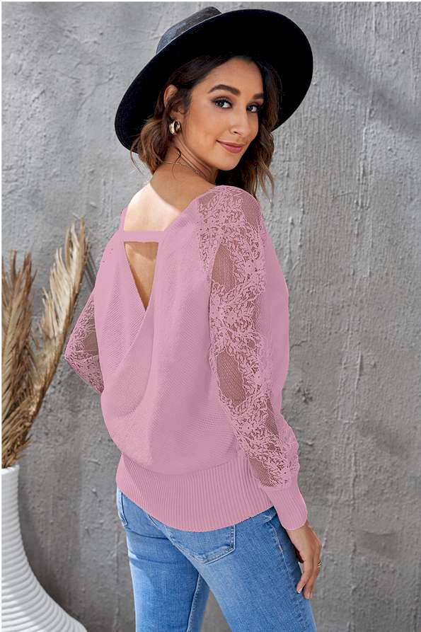 Pink Sexy V Neck Surplice Hollow-out Sweater with Lace Sleeves