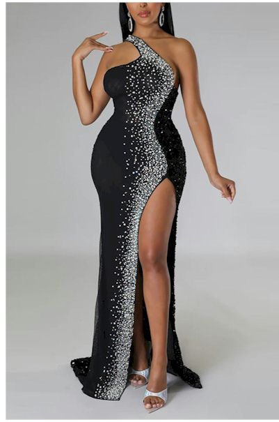 Dare to stand out in this dazzling rhinestone-sequin maxi gown! With a daring high slit and zip-up fit, you'll make a remarkable entrance anywhere you go. Choose from sizes S to 2XL and sparkle the night away.