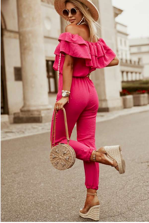 Rose Ruffled Off Shoulder Jogger Jumpsuit